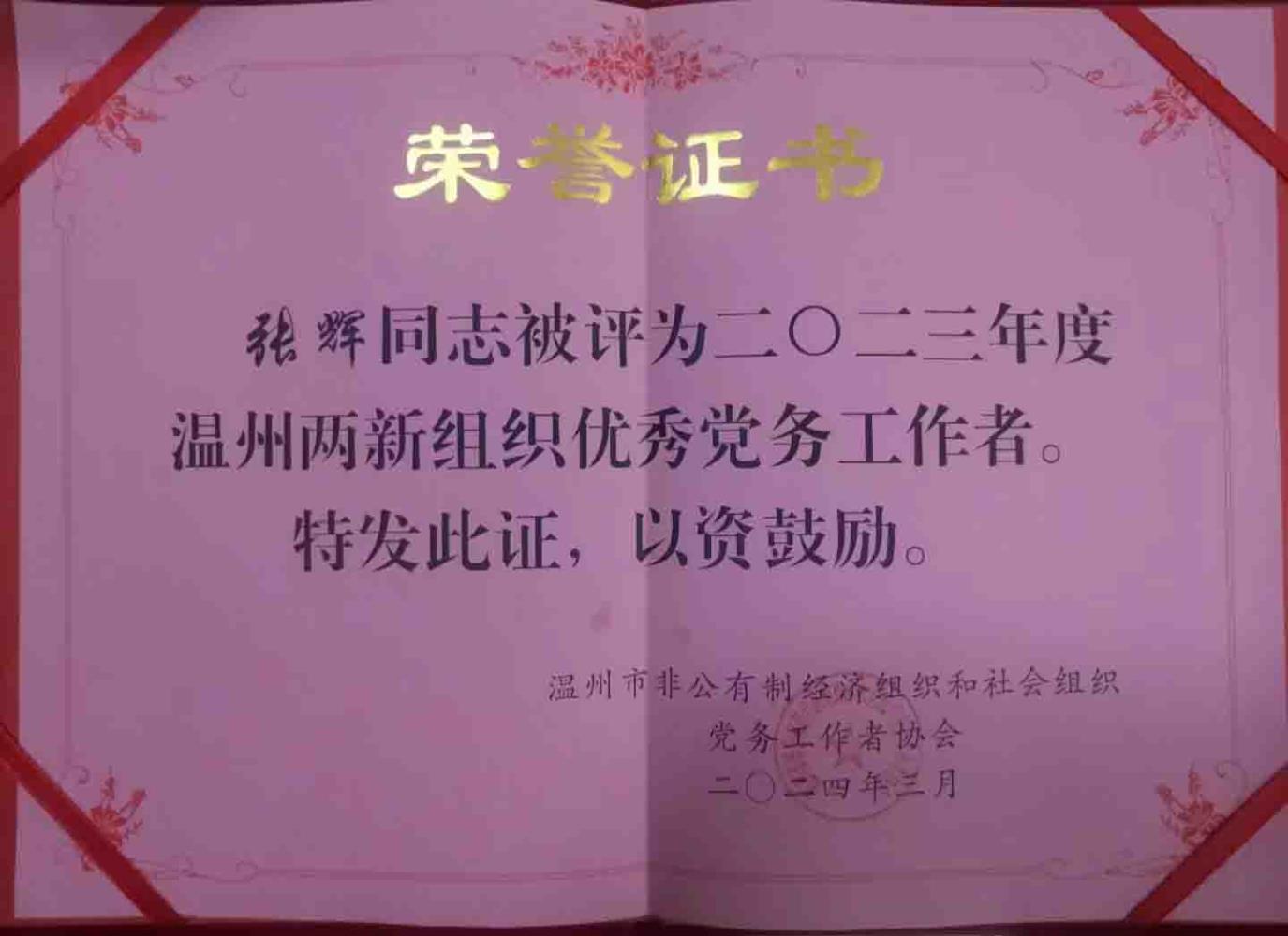 張輝同志被評為2023年度溫州兩新組織優(yōu)秀黨務(wù)工作者